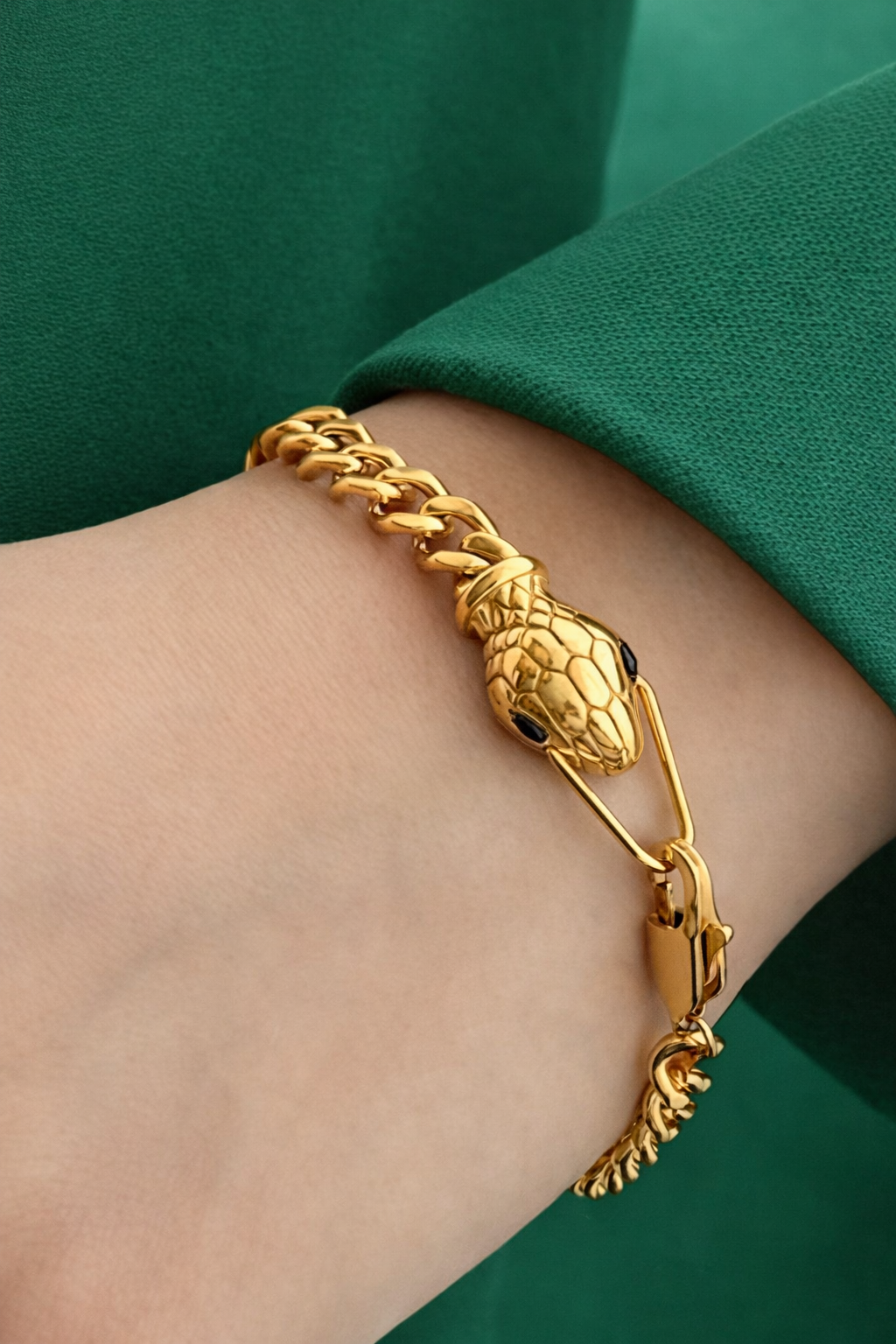 | 🔹 Design | Snake Head Clasp with Curb Chain Links |